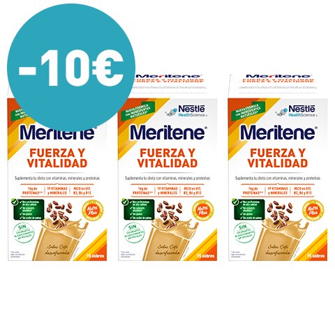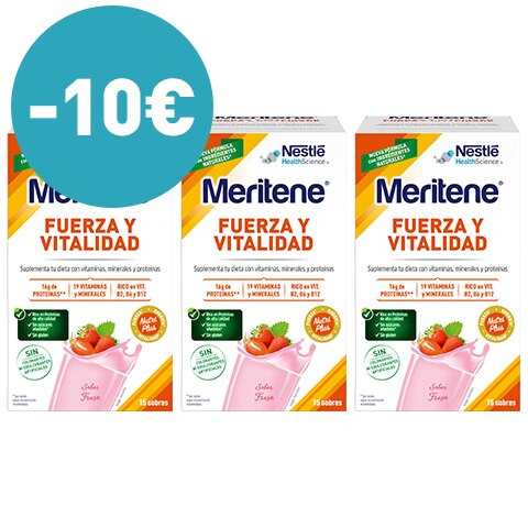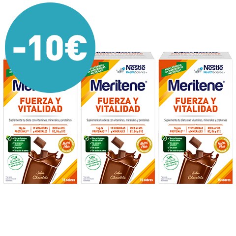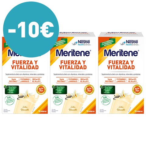 Meritene® FUERZA Y VITALIDAD es una solución nutricional en formato polvo para diluir y obtener un delicioso batido. Su fórmula NutriPlus contiene proteínas, de alta calidad, y 19 vitaminas y minerales. Sus ingredientes permiten suplementar la dieta, contribuyen a disminuir el cansancio y la fatiga y al funcionamiento normal del sistema inmunitario. ¡Un PLUS en tu nutrición para DISFRUTAR al máximo cada día!