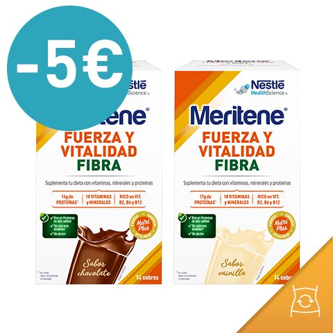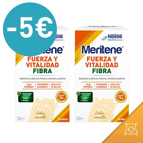 Batido Meritene® FUERZA Y VITALIDAD con un extra de fibra 100% soluble para aquellas personas que, a parte del plus de fuerza y vitalidad que aporta, necesitan un aporte extra de fibra en su alimentación que ayude a facilitar el tránsito intestinal.