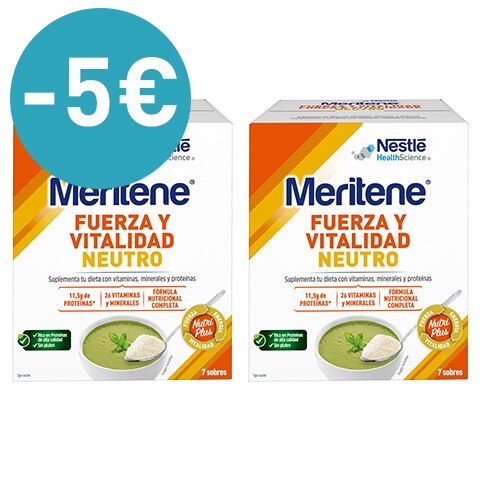 Meritene® FUERZA Y VITALIDAD Neutro es una solución nutricional sencilla para añadir a tus platos favoritos sin apenas variar el sabor, ni la textura, especialmente pensada para personas que necesitan suplementar su alimentación sin aumentar el volumen de sus comidas. Aporta a cada plato 26 vitaminas y minerales y proteínas, de alta calidad, para ayudar a mantener la masa muscular, disminuir el cansancio y la fatiga, y contribuir a la función normal del sistema inmunitario. Ideal para diluir en sopas, purés, batidos o salsas sin alterar su sabor ni aumentar significativamente su volumen, haciendo que sea más fácil tomarlo. ¡Nutrirse mejor sin aumentar el volumen de tus comidas, es posible!
